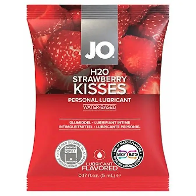 С оральными лубрикантом JO H2O Strawberry Kiss Ваши интимные поцелуи будут незабываемо вкусными. Прекрасный аромат и сладкий клубничный вкус сделают оральные ласки приятными для обоих партнеров и подарят чувственное наслаждение. Смазка изготовлена на водной основе и полностью съедобна. Она также совместима с изделиями из латекса, а также другими материалами, которые используются при изготовлении секс-игрушек. Объем - 5 мл