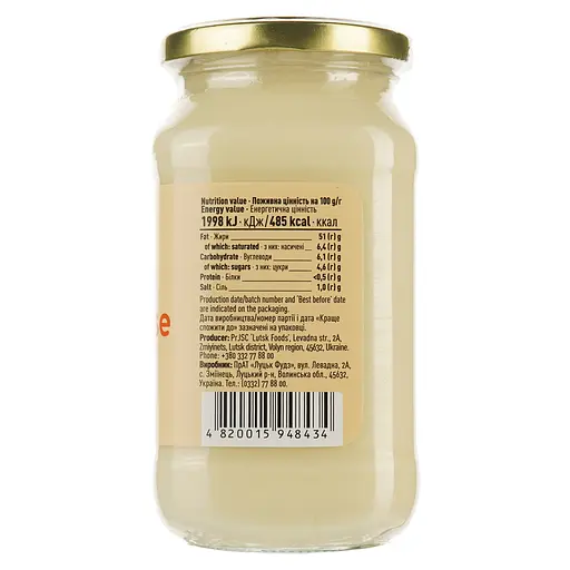 Люблю цю торгівельну марку!!! Все у них гарної якості ,завжди в стеклі ,починаючи з соусу і закінчуючи оцетом !!!без перебільшення крутий бренд ,який любить свого покупця !!!!!! Майонез не став винятком!!! Іноді хочеться легкий салатик ,з малим відсотком жирності!!! Круто підійде,тим хто на дієті!!!бо майонези нижче 50% то не майонез а лайно !!!!рекомендую Щіро !!!!!!