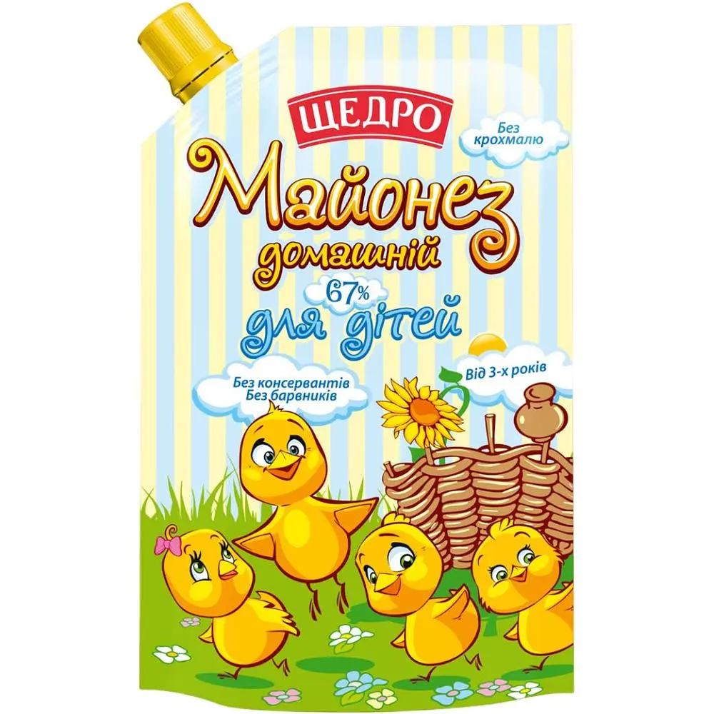 До конца акции 12 днейМайонез Щедро Домашний для детей 67% - вкусный продукт для детей от 3-х лет. Не содержит крахмала, красителей, консервантов, стабилизаторов. Для ярких салатиков и питательных бутербродов.