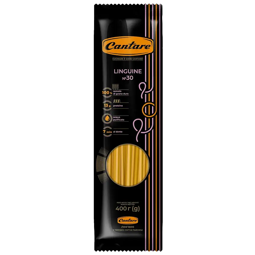 Макаронные изделия Cantare Linguine №30 - это украинский бренд пасты, изготовленный из твердых сортов пшеницы.