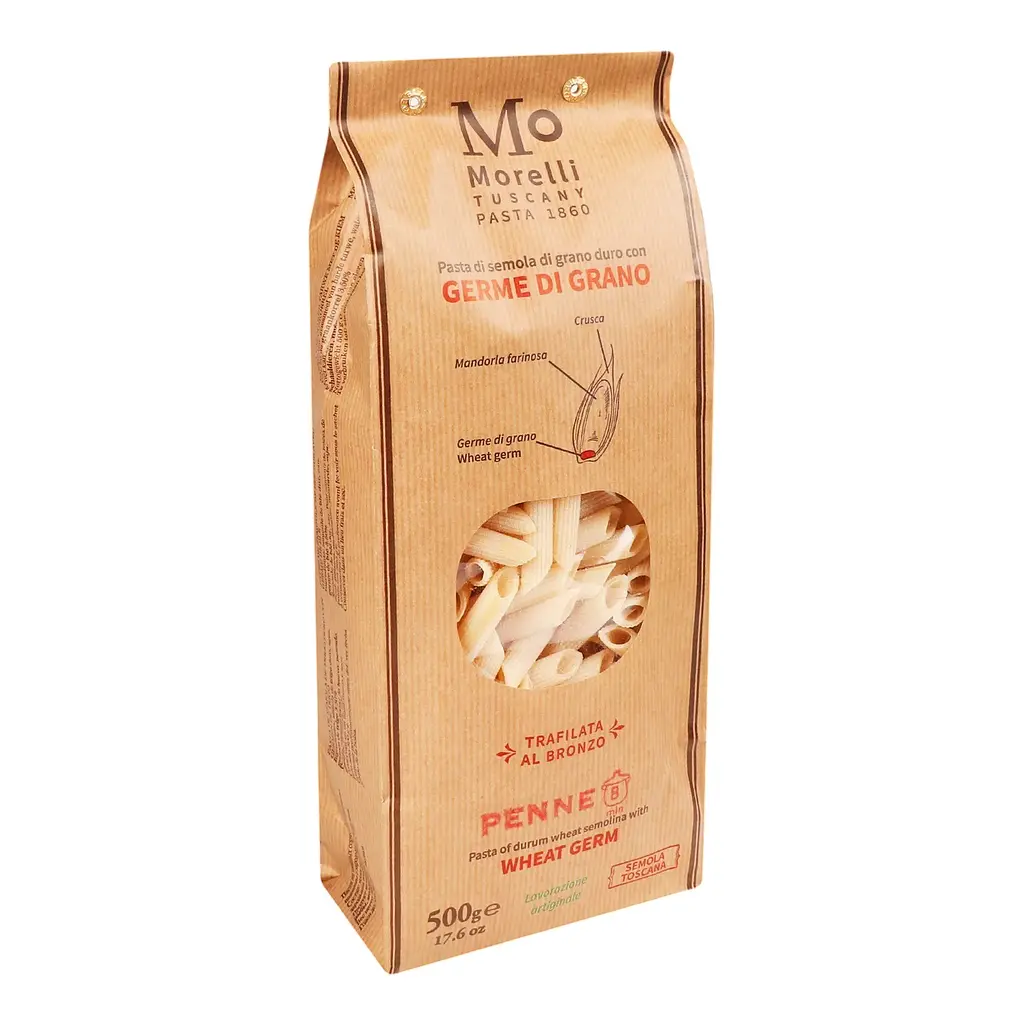 Макаронные изделия Morelli Перья из пшеничных зародышей - это инновационный продукт от итальянской семейной компании Morelli, сочетающий классическую форму пасты с повышенной пищевой ценностью. Особенностью этой пасты является добавление зародышей пшеницы (Germe di Grano).