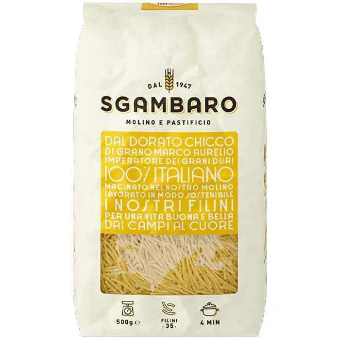 Filini, Sgambaro - тонкая нитевидная паста с экологическим натуральным составом от итальянского производителя. В составе пасты только два ингредиента: мука из твердых сортов пшеницы и чистая вода, благодаря чему макароны не развариваются и сохраняют аппетитную форму. Паста из цельной пшеницы имеет большее содержание белков и является идеальным источником сложных углеводов, поддерживающих стабильный уровень сахара в крови и регулирующих пищеварение. Производитель использует классическую бронзовую матрицу при создании пасты, чтобы сохранить оригинальную текстуру.