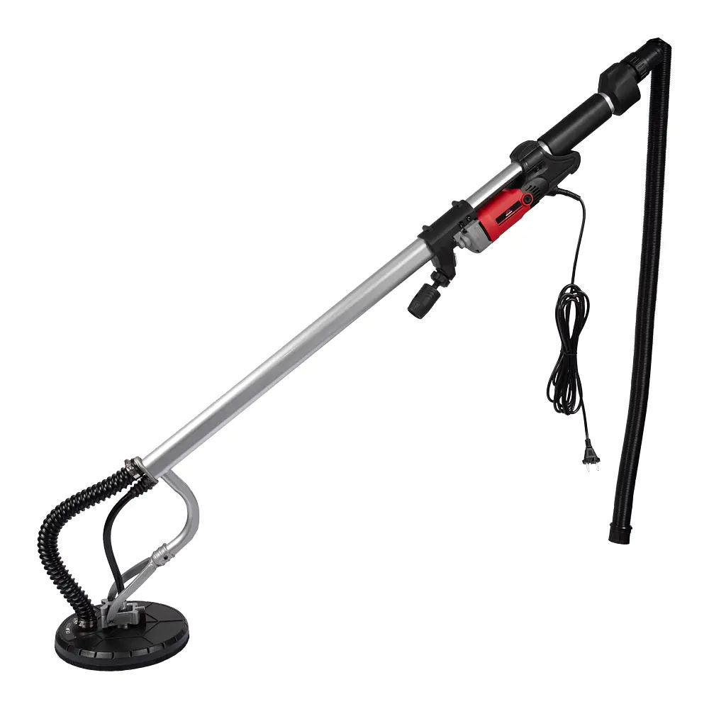 Подошва шлифмашины наделена липучкой, которая позволит очень быстро изменить абразивную бумагу с необходимым размером зерна. Диаметр подошвы составляет 225 мм. Длина штанги составляет 160 см. Это позволит легко обрабатывать потолки и стены в верхней части. Уникальная система регулировки основания выполнена из алюминия. Регулировка позволяет добиться отличных результатов шлифовки даже на неровной поверхности.
