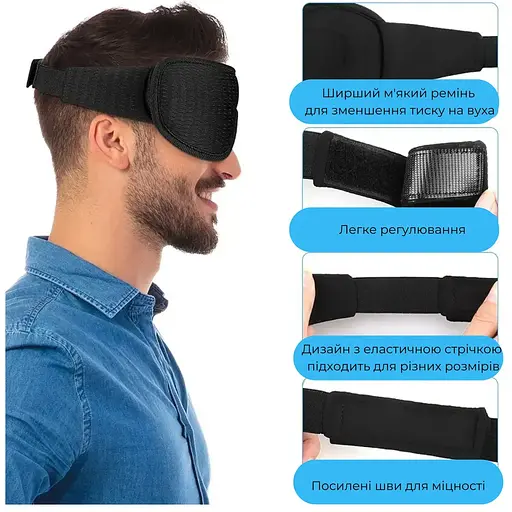 Маска выполнена из воздухопроницаемого материала, предотвращающего перегрев и потливость, обеспечивая комфорт даже при длительном использовании. Эргономичный 3D-дизайн позволяет свободно моргать, не прикасаясь к веку, что делает эту маску идеальной для использования как дома, так и в поездках.