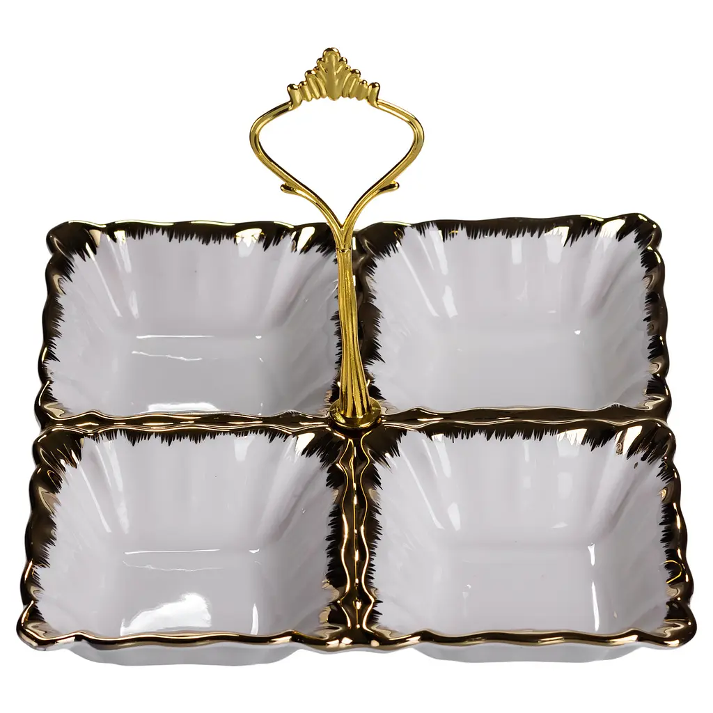 Элегантная фарфоровая менажница с ручкой - это стильный сервировочный элемент, который сочетает изысканность и функциональность. Она идеально подойдет для хорошей подачи закусок, соусов, орехов, сладостей или фруктов.