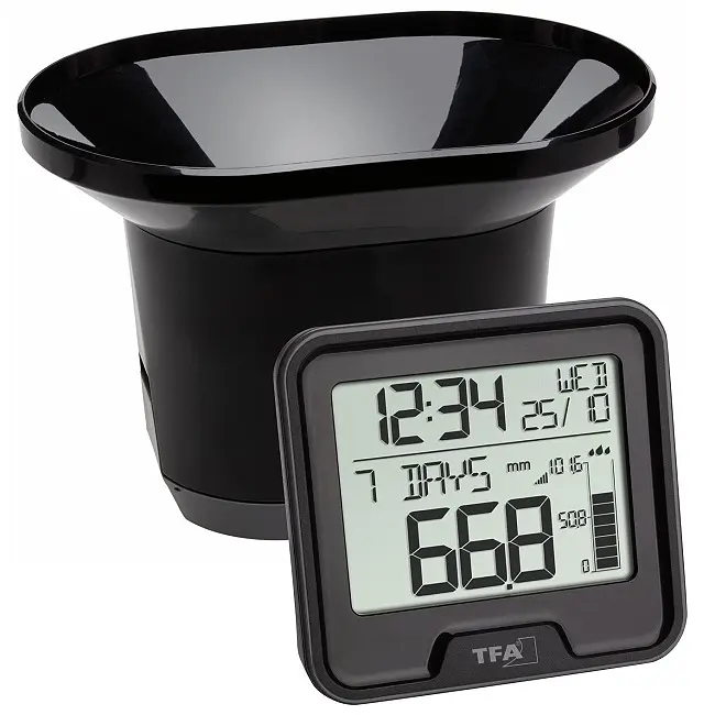 Производитель: TFA Dostmann GmbH & Co.KG, ГерманияОсобенности:Беспроводная передача показаний количества осадков (до 100 м на открытой местности)Отображение и графическое представление текущего количества осадков, за последний час, последние 24 часа, последние 7 дней, текущий месяц, текущий год и общего количества осадковЕжемесячная история последних 12 месяцевОповещение о дожде (24 часа)Температура в помещенииВремя и датаЗарегистрированный дизайн TFAС помощью беспроводного дождемера DROP вы будете получать информацию о трех показателях одновременно: количество осадков, температура в помещении и время суток. Датчик дождя передает измеренные значения по беспроводной связи на базовую станцию, которую вы можете установить или повесить на стене, например, в гостиной. Измерительный контейнер размещается на открытом воздухе горизонтально, в идеале на высоте от 60 до 90 см, и собирает осадки. Обратите внимание, однако, что передатчик должен находиться в месте, которое не защищено деревьями или чем-то еще, и где дождь может свободно падать со всех сторон. Дождемер DROP имеет еще больше полезных функций: вы можете сравнить количество осадков со значениями за месяц предыдущего года с помощью функции истории. Количество осадков отображается на графике. Вы можете посмотреть значения количества осадков за разные периоды времени: за последние 24 часа, последние 7 дней, общее количество осадков с момента ввода в эксплуатацию. Функция оповещения о дожде (24 часа) предупреждает вас, как только выпадает больше дождя, чем установленный вами индивидуальный лимит. Если значение превышено, раздается звуковой сигнал, и на дисплее мигает символ.