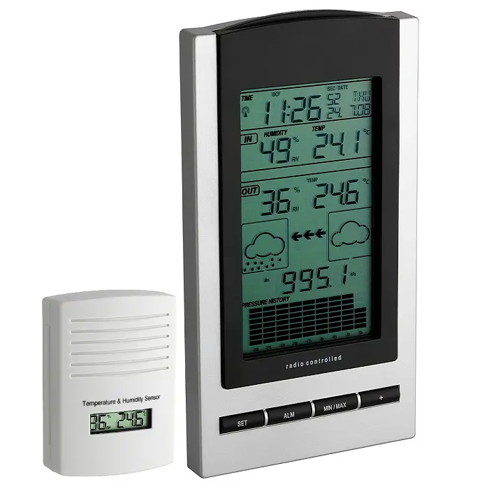 Производитель: TFA Dostmann GmbH & Co.KG, ГерманияОсобенности:Беспроводная передача внешней температуры и влажности через передатчикВнутренняя температура и влажностьМаксимальные и минимальные значения за сутки с временем и датой записиБарометрические погодные символы для фактической погоды и прогнозируемойТенденция атмосферного давления, абсолютное и относительное атмосферное давление, гистограмма с отображением атмосферного давления за последние 24 часаПрограммируемые функции сигнализации для определенных погодных условий, таких как температурный сигнал, штормовое предупреждениеТочка росыРадиоуправляемые часы с будильником с функцией повтора и датойПодсветкаКакая сегодня местная погода? Достаточно взглянуть на беспроводную метеостанцию «GAIA», и вы всегда будете в курсе событий. Четкий дисплей показывает много деталей о местных погодных условиях. Температура и влажность наружного воздуха определяются отдельным беспроводным датчиком на месте. Кроме того, встроенный электронный барометр измеряет давление воздуха и отображает символ текущей погоды; другой символ дает прогноз погоды на основе изменений атмосферного давления. Текущее давление воздуха отображается в виде абсолютного и относительного значения, на гистограмме можно наблюдать историю последних 24 часов, что позволяет получить более точное представление о погоде. Для контроля климата в помещении отображаются температура и влажность. С целенаправленным отоплением и вентиляцией вы создаете приятную и здоровую среду обитания и даже экономите на расходах на отопление. Метеостанция предлагает множество дополнительных функций и информации. Вы можете включить штормовое предупреждение, установить пределы тревоги для многих параметров, получить максимальные и минимальные значения с временем записи и рассчитать точку росы. Текущее время и дата принимаются через радиосигнал DCF-77. Будильник всегда разбудит вас в нужное время. Четкий дисплей хорошо читается даже в темноте благодаря подсветке.
