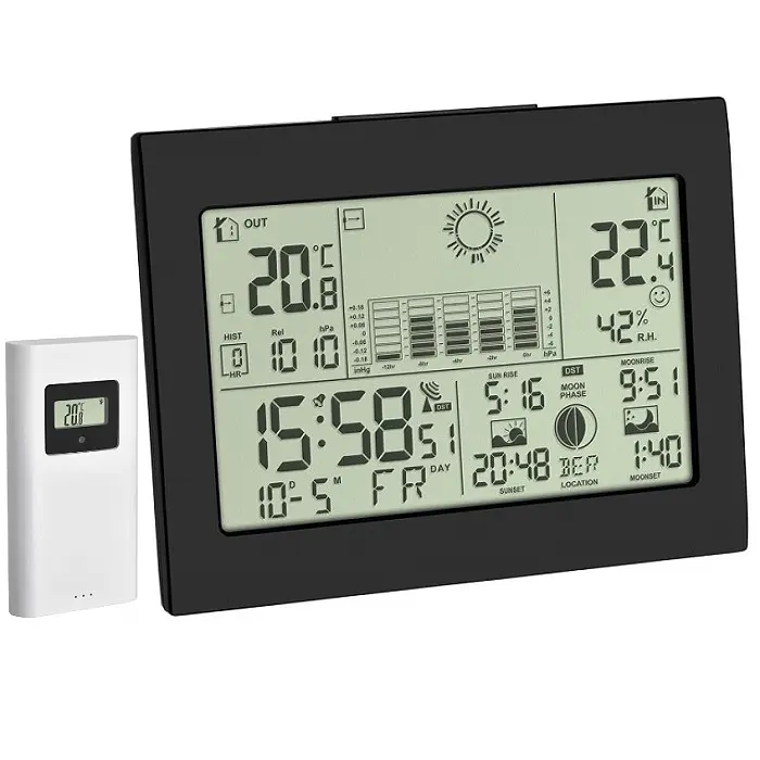 Производитель: TFA Dostmann GmbH & Co.KG, ГерманияОсобенности:Беспроводная передача температуры наружного воздуха (433 МГц), дальность до 60 м (открытое пространство), с индикатором тенденции. Возможность расширения до 3-х внешних датчиков, также для контроля температуры в удаленных помещениях, например, детская комната, винный погреб и т.д.Внутренняя температура и влажность с индикатором уровня комфортаМаксимальные / минимальные значенияПрогноз погоды с символами и тенденция атмосферного давленияАбсолютное или относительное атмосферное давлениеГистограмма с указанием атмосферного давления за последние 12 часовРадиоуправляемые часы с датой и днем неделиДва будильника с функцией повтораВремя восхода и захода солнца и луны (150 европейских городов на выбор)Индикация фактической фазы луныПодсветкаНастенный или настольный монтажДостаточно взглянуть на дисплей беспроводной метеостанции HORIZON, и вы всегда будете в курсе развития местной погоды. Беспроводной термодатчик (входит в комплект) определяет температуру наружного воздуха непосредственно на месте. Встроенный электронный барометр измеряет давление воздуха; историю за последние 12 часов можно наблюдать на гистограмме. Солнце, облака или капли дождя — на основе изменений атмосферного давления символ погоды в сочетании со стрелками тенденции отображает прогноз на будущую погоду. Для контроля климата в помещении отображаются температура и влажность. Благодаря целенаправленному отоплению и вентиляции вы создаете приятную и здоровую среду обитания и даже экономите на расходах на отопление. Текущее время и дата принимаются через радиосигнал DCF77. Вы также можете подключить до двух дополнительных передатчиков (продаются отдельно) для контроля температуры в нескольких комнатах.