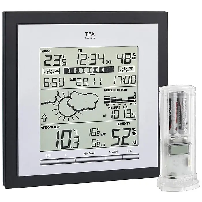 Производитель: TFA Dostmann GmbH & Co.KG, ГерманияОсобенности:Беспроводная передача внешней температуры и влажности через датчикЧеткий дисплей с большим количеством информации о погодеИндикация температуры и влажности в помещенииМакс. / мин. — функция для температурыПрогноз погодыТенденция изменения атмосферного давленияАбсолютное и относительное атмосферное давление, гистограмма с историей изменения атмосферного давления за последние 12 часовЧасы с будильником и датойВремя восхода / захода солнца и продолжительность дня в 150 европейских городахФаза ЛуныВысокоточный гигрометр с датчиком «Swiss Precision sensor»IT+ технология радиопередачи сигнала от внешнего датчикаЗарегистрированный дизайн TFAКак развивается местная погода сегодня? Взгляните на беспроводную метеостанцию «LINEA PLUS», чтобы составить представление. Четкий дисплей показывает много деталей о местных погодных условиях. Уличный беспроводной датчик определяет температуру и влажность наружного воздуха в вашем регионе. Встроенный электронный барометр измеряет атмосферное давление воздуха; историю за последние 12 часов можно наблюдать на гистограмме. Солнце, облака или капли дождя — символы, основанные на изменениях атмосферного давления, дают прогноз на будущую погоду. Для контроля климата в помещении отображаются значения температуры и влажности. Благодаря целенаправленному отоплению и вентиляции вы создаете приятную и здоровую среду обитания и даже экономите на расходах на отопление. Станция отображает текущее время и дату. Есть будильник. Кроме того, вы можете увидеть время восхода и захода солнца в 150 европейских городах.