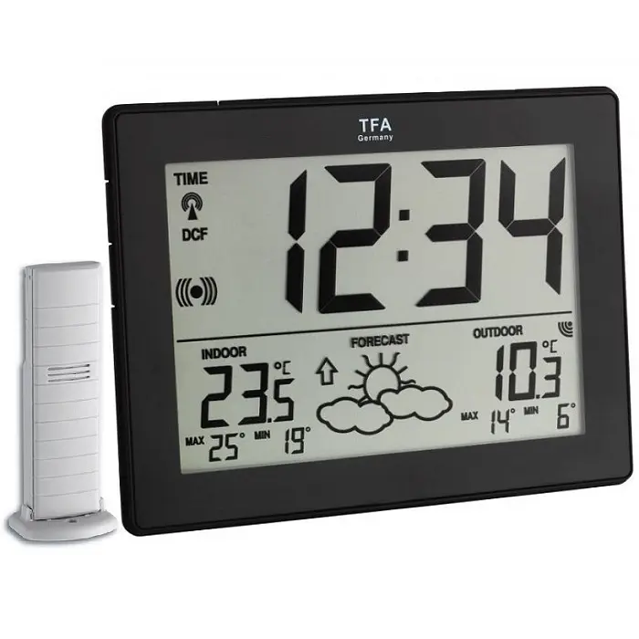 Производитель: TFA Dostmann GmbH & Co.KG, ГерманияОсобенности:Беспроводная передача температуры с улицы через передатчик Индикация температуры в помещении Макс.-мин.-функция Барометрический прогноз погоды, тенденция атмосферного давления Радиоуправляемые часы с будильником и функцией повтора Широкоформатный дисплей IT + технология радиопередачи сигнала от внешнего датчика Сколько часов и какая сегодня погода? Взглянув на очень четкое изображение беспроводной метеостанции «METRO», вы сразу увидите всю картину. Текущее время принимается через радиосигнал DCF-77 и отображается крупными цифрами. Температура наружного воздуха определяется беспроводным передатчиком на месте, датчик в помещении измеряет температуру в помещении. Максимальное и минимальное значение для обеих температур отображаются постоянно. Солнце, облака или капли дождя — встроенный электронный барометр измеряет давление воздуха и на основании измерений отображается символ погоды, который дает прогноз на будущую погоду.