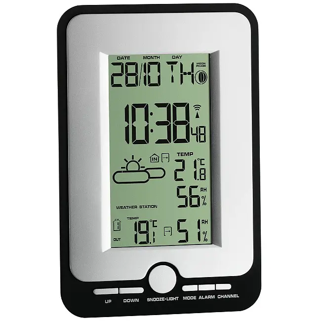 Производитель: TFA Dostmann GmbH & Co.KG, ГерманияОсобенности:Данные о внешней температуре и влажности, передаваемые с беспроводного внешнего датчика на частоте 433 МГц на расстояние до 80 метров (в открытом пространстве)Возможность приема показаний от 3-х внешних датчиков (можно приобрести дополнительно)Комнатная температура и влажностьУровень комфорта в помещенииИндикация направления изменения температурыМаксимальные и минимальные значенияНастраиваемый пользователем сигнализатор для наружной температурыПиктограммы прогноза погоды (солнечно, переменная облачность, с прояснениями, дождь). Прогноз погоды основан на изменениях температуры и влажности на улицеФаза ЛуныРадиоуправляемые часы с высокой точностью и возможностью ручной настройкиНастройка часового пояса -12 / +12 часов. День недели и дата. Будильник с функцией отсрочки звонка будильника Snooze. Заднюю подсветку дисплея. Большой, легко читаемый дисплей. Зарегистрированный дизайн TFA. Современная метеостанция MULTY обладает множеством полезных функций, связанных с погодой. Температура и влажность наружного воздуха определяются отдельным беспроводным датчиком на месте; символ погоды оценивает измеренные значения и предоставляет информацию о погодных условиях. Также измеряются температура и влажность в помещении, поэтому вы всегда можете поддерживать микроклимат в пределах зоны комфорта с помощью целевого обогрева и вентиляции. Это создает приятную и здоровую среду обитания и даже позволяет сэкономить на отоплении. MULTY предлагает возможность контролировать микроклимат в двух других местах, например: спальня, детская, подвал, зимний сад, с двумя дополнительными термогигропередатчиками, которые можно приобрести в качестве опции. Множество полезных функций, таких как тенденция температуры, максимальные и минимальные значения и регулируемая сигнализация температуры, дополняют набор функций. Текущее время и дата принимаются по радиосигналу DCF-77. Будильник всегда поможет вам встать с постели в нужное время. А благодаря подсветке четкий дисплей хорошо читается даже в темноте.