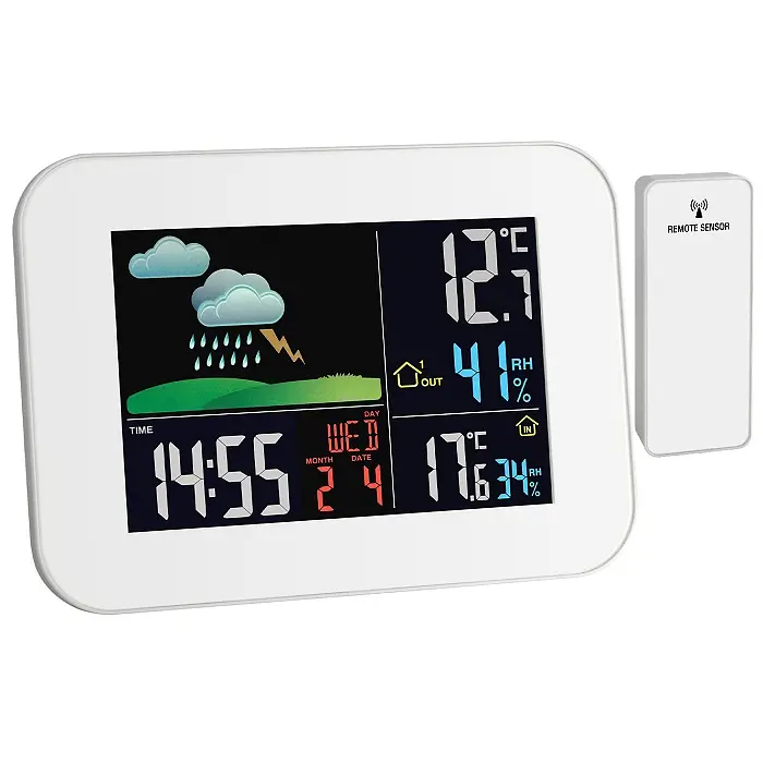 Производитель: TFA Dostmann GmbH & Co.KG, ГерманияОсобенности:Анимированный прогноз погоды с пиктограммамиБольшой цветной дисплей (125 х 80 мм) с двумя уровнями подсветкиВнешняя температура и влажность передаются от беспроводного внешнего датчика на частоте 433 МГц, расстояние передачи до 60 метров (открытое пространство)Метеостанция может принимать показания от 3-х внешних датчиков, а также контролировать климат в удаленных помещениях, например, таких как детская комната, винный погреб и т.п.Комнатная температура и влажностьМаксимальные и минимальные значения с автоматической сброской в полночьТочка росыИндекс теплаРадиоуправляемые часыБудильник с функцией отсрочки сигнала SnoozeКалендарьUSB-порт: возможность зарядки устройств с поддержкой USB (1 А)Адаптер переменного тока (230 В AC / 5,0 В DC) в комплектеЗарегистрированный дизайн TFAДекоративная беспроводная метеостанция PRIMAVERA от TFA показывает погоду в виде ярких иллюстраций! Вы всегда будете в курсе погоды, просто взглянув на цветной дисплей. Солнце, облака или капли дождя — встроенный электронный барометр измеряет атмосферное давление и на основе изменений погодный символ дает прогноз на будущую погоду. Отдельный беспроводной датчик определяет температуру и влажность наружного воздуха в своем месте. Для контроля микроклимата в помещении отображаются температура и влажность. Благодаря целенаправленному отоплению и вентиляции вы создаете приятную и здоровую среду обитания и даже экономите на отоплении. Кроме того, вы можете получить максимальные и минимальные значения, точку росы и индекс тепла. Текущее время и дата принимаются по радиосигналу DCF77. Будильник всегда поможет вам встать с постели в нужное время. Цветной дисплей можно настроить на два уровня яркости или полностью отключить, как опцию. Два дополнительных датчика для контроля температуры и влажности, например в детской, спальне, погребе или гараже, можно подключить (приобретаются отдельно). Особенностью является встроенная функция зарядки для устройств с USB-портом, с помощью которой вы можете заряжать свой смартфон на ночь (только при работе с адаптером питания). Точка росы. Если воздух постоянно охлаждается при постоянной абсолютной влажности, то относительная влажность будет неуклонно увеличиваться до максимального значения 100%. Если воздух будет продолжать охлаждаться и дальше, то избыточный водяной пар выпадет в осадок в виде капель воды. Коэффициент тепла Восприятие температуры в сочетании с влажностью.