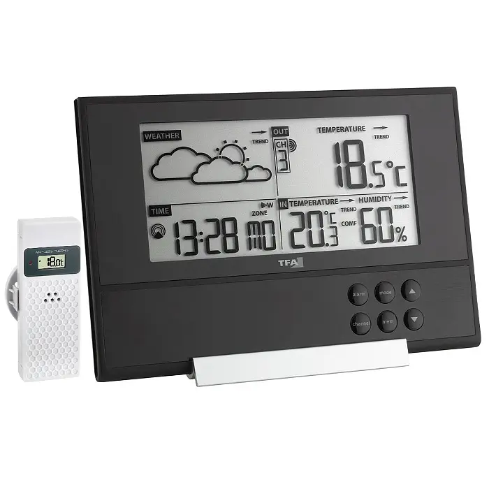 Производитель: TFA Dostmann GmbH & Co.KG, ГерманияОсобенности:Ультратонкий корпус (9,5 мм)Беспроводная передача температуры снаружи через передатчик (макс. 3 шт.)Индикация температуры и влажности в помещенииУровень комфортаБарометрический прогноз погоды с погодными символамиИндикаторы тенденцииФункция max-min. значенийТемпературный сигнализаторРадиоуправляемые часы с датой и днем недели (7 языков)Разное время будильника (рабочий день, выходные, ранний сигнал для предупреждения о заморозках)Зарегистрированный дизайн TFAЭто настолько тонко, насколько это возможно. В современном дизайне «PURE» от TFA показывает погоду самым красивым образом. Высокоглянцевый акрил в сочетании с черной матовой алюминиевой передней панелью и все это в тонком корпусе толщиной всего около 9,5 мм. Простая и понятная, метеостанция «PURE» вписывается в любой интерьер, будь то на столе или на стене. Солнце, облака или капли дождя — встроенный электронный барометр измеряет давление воздуха и на основе смены символов погоды дает прогноз на ближайшие дни. Температура наружного воздуха определяется собственным беспроводным датчиком на месте. Для управления климатом в помещении отображаются температура и влажность, а индикатор уровня комфорта позволяет узнать, являются ли условия идеальными, или необходима активная вентиляция или увлажнитель воздуха. Текущее время и дата принимаются через радиосигнал DCF-77. Разное время будильника в будние и выходные дни всегда приводит к тому, что вы встаете с постели в нужное время. В дополнение к температуре наружного воздуха, «PURE» предлагает возможность автоматического пробуждения раньше, если есть риск замерзания, так что вы можете очистить лобовое стекло от льда и подготовиться к условиям неспешного вождения. Еще два датчика температуры могут быть подключены для наблюдения за детской, спальней, подвалом или гаражом.