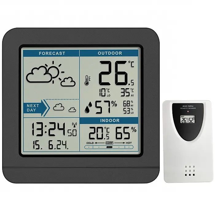 Производитель: TFA Dostmann GmbH & Co.KG, ГерманияОсобенности:Беспроводная передача данных о температуре и влажности с помощью датчика (макс. 60 м)Комнатная температура и влажность с уровнем комфортаПрогноз погоды в виде символовПостоянная индикация максимальных и минимальных значений наружной температуры с автоудалением через 24 часаДополнительная память максимальных и минимальных значений с ручным сбросом, которая показывает время и дату записи Сигнал тревоги по наружной температуре Символ мороза Радиоуправляемые часы с датой и днем недели Будильник с функцией отсрочки сигнала snooze Дисплей с голубой подсветкой элементов Подсветка Какая погода? Достаточно взглянуть на метеостанцию SKY, и вы сразу увидите картину. Символы погоды показывают текущее состояние погоды и прогноз на следующий день. Беспроводной датчик измеряет температуру и влажность наружного воздуха. Максимальное и минимальное значения отображаются постоянно и автоматически сбрасываются ежедневно. Дополнительная память с ручным сбросом позволяет просматривать максимальные и минимальные значения за выбранный период времени. Встроенные датчики базовой станции измеряют температуру и влажность в помещении и показывают уровень комфортности воздуха. Время и дата обновляются по радиосигналу. Будильник с функцией повтора. Дисплей выполнен в двух цветах, четко структурирован и поэтому легко читается. Подсветка активируется нажатием кнопки.