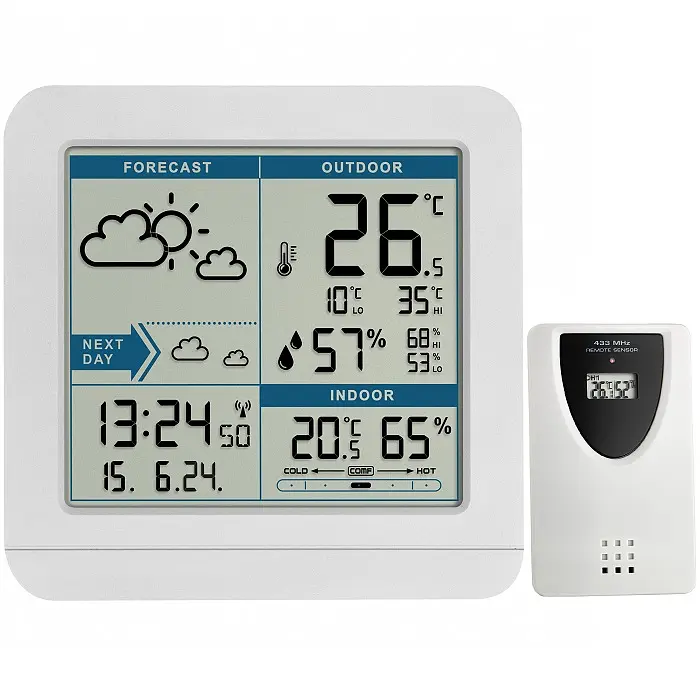 Производитель: TFA Dostmann GmbH & Co.KG, ГерманияОсобенности:Беспроводная передача данных о температуре и влажности с помощью датчика (макс. 60 м)Комнатная температура и влажность с уровнем комфортаПрогноз погоды в виде символовПостоянная индикация максимальных и минимальных значений наружной температуры с автоудалением через 24 часаДополнительная память максимальных и минимальных значений с ручным сбросом, которая показывает время и дату записи Сигнал тревоги по наружной температуре Символ мороза Радиоуправляемые часы с датой и днем недели Будильник с функцией отсрочки сигнала snooze Дисплей с голубой подсветкой элементов Подсветка Какая погода? Достаточно взглянуть на метеостанцию SKY, и вы сразу увидите картину. Символы погоды показывают текущее состояние погоды и прогноз на следующий день. Беспроводной датчик измеряет температуру и влажность наружного воздуха. Максимальное и минимальное значения отображаются постоянно и автоматически сбрасываются ежедневно. Дополнительная память с ручным сбросом позволяет просматривать максимальные и минимальные значения за выбранный период времени. Встроенные датчики базовой станции измеряют температуру и влажность в помещении и показывают уровень комфортности воздуха. Время и дата обновляются по радиосигналу. Будильник с функцией повтора. Дисплей выполнен в двух цветах, четко структурирован и поэтому легко читается. Подсветка активируется нажатием кнопки.