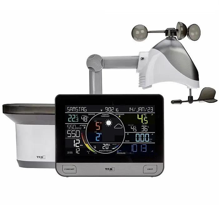 Особенности: Цветной дисплей с 4 уровнями яркости и функцией регулировки яркости (при непрерывной работе только с адаптером питания) С комбинированным датчиком (на солнечной энергии) для беспроводной передачи данных о температуре и влажности наружного воздуха, скорости и направлении ветра, а также беспроводным датчиком дождя (868 МГц, макс. 100 м) Индикация температуры и влажности в помещении Прогноз погоды с цветным изображением погоды и атмосферным давлением Макс. мин. функция, охлаждение ветром и точка росы Сигнализация о температуре, влажности, дожде и ветре Время и дата с днем недели отображаются полными буквами На станции могут отображаться дополнительные датчики (доступны в качестве опции) Дополнительные функции на станции через Профессиональный прогноз погоды для региона на несколько дней и частей суток с ожидаемыми максимальными и минимальными значениями и вероятностью дождя от онлайн-метеосервиса, автоматическая настройка времени и персонализированные уведомления Дополнительные функции через бесплатное приложение: получение измеренных значений со станции по всему миру (включая историю за последние 30 дней), настраиваемые пороги тревоги и push-уведомления в случае тревоги, можно добавить дополнительные датчики (доступны в качестве опции). Совместимые датчики: 30.3800.02 / 30.3239.02 (термо-гигродатчик), 30.3801.02 (датчик ветра), 30.3238.06 (датчик для бассейна), 14.1514.10 (датчик для барбекю), 30.3802.02 (датчик дождя) Адаптер питания и резервная батарея CR2032 3 В в комплекте Зарегистрированный дизайн TFA Описание Если вы хотите вести комплексное наблюдение за погодой, VIEW PRO подойдет именно вам. Беспроводная метеостанция с Wi-Fi дополняет данные ваших локальных наблюдений профессиональными прогнозами онлайн-метеослужбы. Станция имеет два внешних датчика: комбинированный датчик с солнечной батареей измеряет скорость и направление ветра, а также контролирует температуру и влажность воздуха. Дождемер определяет количество осадков в месте расположения. Данные передаются на базовую станцию на расстояние до 100 м (на открытом пространстве). Встроенный электронный барометр измеряет давление воздуха, а цветное изображение погоды дает прогноз будущей погоды. У вас также есть индикация температуры и влажности в помещении, и вы можете контролировать климат в помещении с помощью целевого отопления и вентиляции. Кроме того, VIEW PRO предлагает дополнительную информацию, такую как максимальные и минимальные значения, ощущаемую температуру «холодного ветра», точку росы и настройки сигнализации для нескольких параметров, а также часы с полным отображением даты и дня недели. На станции может отображаться до 4 дополнительных датчиков, например, для контроля температуры и влажности в детской комнате или датчик в бассейне. Высококонтрастный цветной дисплей можно регулировать на трех уровнях яркости и он автоматически затемняется в ночное время. Эти функции доступны без подключения к Интернету; это означает, что VIEW PRO также можно использовать как полноценную «автономную» метеостанцию. Метеостанция интегрируется в локальную сеть WLAN с помощью бесплатного приложения TFA VIEW. Просто следуйте инструкциям в приложении. Когда станция подключена к Интернету, дисплей меняется, и небольшой символ указывает, какая информация импортируется через онлайн-сервис погоды. 