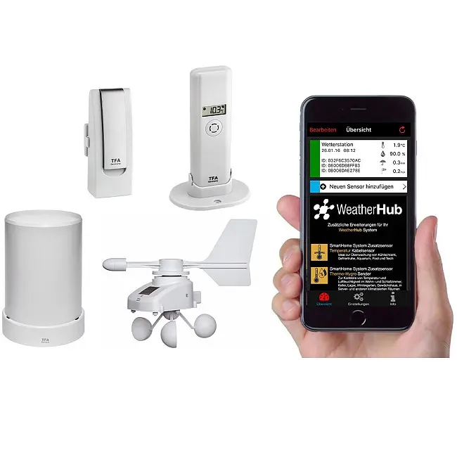 Производитель: TFA Dostmann GmbH & Co.KG, ГерманияОсобенности:Стартовый набор, установленный в качестве основы для системы WeatherHub SmartHome (межсетевой шлюз с адаптером питания и сетевым кабелем)Метеостанция с датчиком температуры/влажности, беспроводным датчиком дождя с указанием количества осадков, количества дождливых дней, среднего количества осадков, измерителем ветра с солнечной панелью для измерения скорости и направления ветра, порыва и максимальной скорости ветраПроверяйте данные в любоевремя и в любом месте с помощью смартфона, а также для нескольких пользователей с помощью бесплатного приложенияРегулируемые пределы тревоги, push-уведомления в случае тревогиДополнительные функции приложения (график, обзор, экспорт данных)Память до 90 дней. Простая установка через интернет-шлюз. Можно подключить до 50 датчиков (868 МГц) и другие совместимые устройства. Для iOS и Android. Теперь вы можете использовать свой смартфон для мобильного мониторинга климата в вашем доме! С системой WeatherHub SmartHome вы можете легко отслеживать климат, температуру и другую информацию по всему дому и саду. Установите датчик именно там, где вы хотите измерить климатические данные. Полученные значения передаются беспроводным способом на модуль межсетевого шлюза, а затем на сервер. Вы можете получать информацию на свой смартфон в любое время и быть в курсе событий, где бы вы ни находились. Системой WeatherHub SmartHome можно легко и быстро управлять с помощью бесплатного приложения.В комплект метеостанции входит шлюз WeatherHub с адаптером питания и кабелем LAN, а также три внешних датчика: термогигрометр для контроля температуры и влажности наружного воздуха, датчик дождя, который надежно информирует вас об осадках, и датчик ветра для определения направления и силы ветра в месте установки. С помощью приложения WeatherHub можно получить текущие показания вашего датчика с историческими значениями до 90 дней. В случае оповещения вы будете проинформированы с помощью push-уведомления. Датчики метеостанции поддерживают функцию «WEATHERHUB» PRO+. Это дает вам доступ к дополнительным функциям, таким как график, функция макс. мин. и экспорт данных. В этот набор можно добавить до 50 передатчиков и подключаемых устройств. WeatherHub. Связь сегодня не знает границ. Технологии умного дома, которые отслеживают и контролируют наш дом, доступны практически для всех бытовых приборов и систем. Датчики и передатчики позволяют нам осуществлять беспроводной мониторинг дома, управлять центральным отоплением или жалюзи с пульта дистанционного управления, открывать окна или поливать сад. Система WeatherHub SmartHome позволяет легко отслеживать температуру, погоду и другие условия в доме и саду, и, если необходимо внести изменения, вы можете принять соответствующие меры.Функции WeatherHub PRO+Графический обзор данныхФункция максимальных и минимальных значенийЭкспорт данных (CSV-файл)