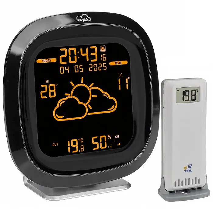 Защита от солнца или зонтик — какая будет погода в ближайшие несколько дней? Если вам нужен профессиональный прогноз погоды непосредственно для вашего дома на несколько дней, беспроводная метеостанция TFA.me ID-04 — правильный выбор для вас. Станция регулярно получает последние прогнозы погоды «Made in Germany» через Wi-Fi от профессионалов с wetter.com — без какой-либо рекламы, подписки или дополнительных затрат. Просто выберите свое местоположение в Интернете один раз, и станция TFA.me предоставит вам мгновенный обзор погоды на один-четыре дня: вы можете выбрать, чтобы на дисплее чередовались четыре дневных сегмента на сегодня или на завтра; либо же четыре дня могут отображаться по очереди, каждый из которых имеет символ полного дня. Прогноз проверяется каждый час и обновляется при необходимости; кроме того, он отображает ожидаемые максимальные и минимальные температуры на день. В случае сложных или потенциально опасных погодных условий рядом с символом погоды для соответствующего дня или периода суток появляется предупреждающий треугольник. Инвертированный дисплей в современном дизайне имеет цветные и подсвеченные сегменты с четырьмя уровнями яркости. Они могут быть установлены в девяти цветовых вариантах: зеленый, белый, голубой, синий, фиолетовый, розовый, красный, оранжевый или желтый. Метеостанция — это настоящий универсал: в дополнение к профессиональному прогнозу погоды станция собирает измеренные значения на месте установки и от совместимых внешних датчиков TFA-ID, находящихся в пределах досягаемости. Они передаются через Интернет на портал TFA.me. Это означает, что вы можете получить доступ к локальным показаниям из дома или сада, находясь в любой точке мира — благодаря браузерному порталу, он гибко работает на вашем смартфоне, планшете или ПК. Просто создайте учетную запись, добавьте станцию и датчики, используя свой индивидуальный идентификационный номер, а затем просмотрите все подключенные устройства в обзоре. Одним щелчком мыши вы можете получить доступ к подробному обзору с графиком трендов, а также настроить уведомления на электронную почту. Станция имеет встроенные датчики, которые измеряют температуру и влажность в помещении в месте установки. До пяти беспроводных термогигропередатчиков (один входит в комплект) с радиусом действия до 100 метров на открытом пространстве предоставляют актуальные данные из вашего сада, гаража или детской комнаты. В дополнение к возможности отображения на экране максимум пяти датчиков, которые переключаются нажатием кнопки или автоматически, станция может принимать множество других датчиков для различных измеряемых параметров. Вы можете получить к ним доступ онлайн через портал TFA.me или получить экспорт данных на электронную почту. Это, кстати, делает TFA.me идеальной системой климат-контроля для вашего дома. В то же время, вы можете получать уведомления по электронной почте, если определенные измеренные значения превышены или не достигнуты. Вы также можете заказать ручной или автоматический экспорт измеренных значений на электронную почту через портал TFA.me. Питание станции осуществляется с помощью кабеля питания, входящего в комплект поставки. Кроме того, три стандартные батарейки типа АА (не входят в комплект) можно использовать в качестве резервного источника питания — наприм