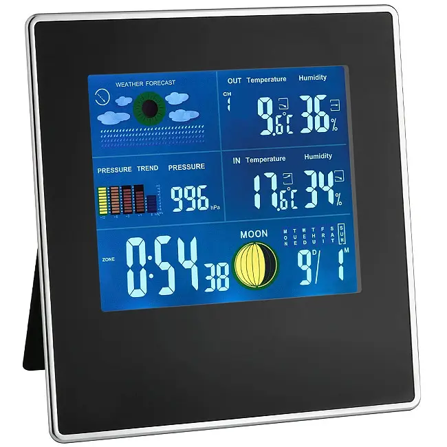 Производитель: TFA Dostmann GmbH & Co.KG, ГерманияОсобенности:Беспроводная передача данных о внешней температуре и влажности через датчик (макс. 3 шт.)Внутренняя температура и влажностьИндикаторы тенденцийМакс.-мин.-функция с автоматической сброскойИндикатор заморозковБарометрический прогноз погодыАтмосферное давление и его тенденцияГистограмма атмосферного давления за последние 12 часовЧасы с двумя будильниками с функцией повтора, датой, вторыми часамиФазы луныЦветная подсветка в непрерывном режиме (с адаптером питания) или временно при касании или хлопанье в ладошиКакая сегодня местная погода? Взглянув на беспроводную метеостанцию «GALLERY», вы сразу видите всю картину. Встроенный электронный барометр измеряет давление воздуха и на основании изменений цветной символ погоды дает прогноз на ближайшие дни. Отображается текущее давление воздуха, историю за последние 12 часов можно наблюдать на гистограмме, что позволяет получить более точное представление о погоде. Температура и влажность наружного воздуха определяются собственным беспроводным датчиком на месте, а климат в помещении измеряется внутренними датчиками станции. Кроме того, «GALLERY» предупреждает вас о возможном риске замерзания, когда температура наружного воздуха опускается ниже 1 °C. Дневные максимальные и минимальные значения сохраняются и автоматически сбрасываются. Часы с двумя разными значениями времени будильника и индикацией текущей фазы луны завершают ряд функций. Цветная подсветка кратковременно включается при хлопке или прикосновении. Дисплей остается постоянно подсвеченным, когда станция подключена к электросети. Два дополнительных датчика могут быть подключены для контроля температуры и влажности, например, в детской, спальне, подвале или гараже.