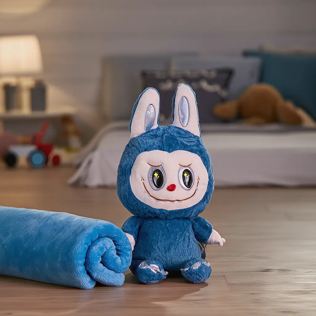 Игрушка изготовлена как яркий и милый герой Labubu. Внутри спрятан мягкий плед, обеспечивающий тепло и комфорт в любой ситуации. С помощью удобной застежки-молнии плед легко достать и так же просто сложить назад, превращая игрушку в подушку и обратно всего за несколько секунд.