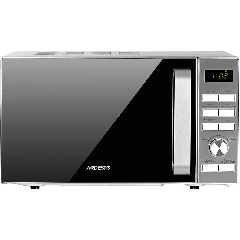 Микроволновая печь Ardesto GO-E735S серебристого цвета с зеркальной дверцей, электронным управлением и дисплеем. Мощность GO-E735S - 700 Вт, есть пять уровней регулировки, а внутренний объем равен 20 л.