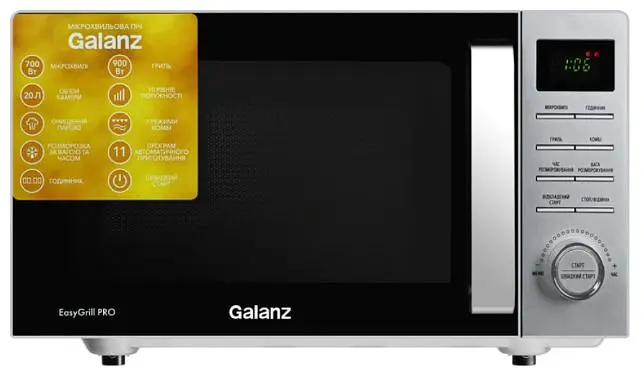 Дверца печи открывается с помощью ручки, а для равномерного разогрева и приготовления пищи в печи предусмотрен поворотный стол. Микроволновая печь имеет украиноязычное меню, что делает ее удобной для использования широкой аудиторией. Мощность гриля составляет 900 Вт, а мощность микроволнового излучения — 700 Вт, что обеспечивает быстрое и эффективное приготовление блюд. Общий вес микроволновой печи составляет 11,1 кг, что свидетельствует о ее надежной конструкции и качественных материалах.
