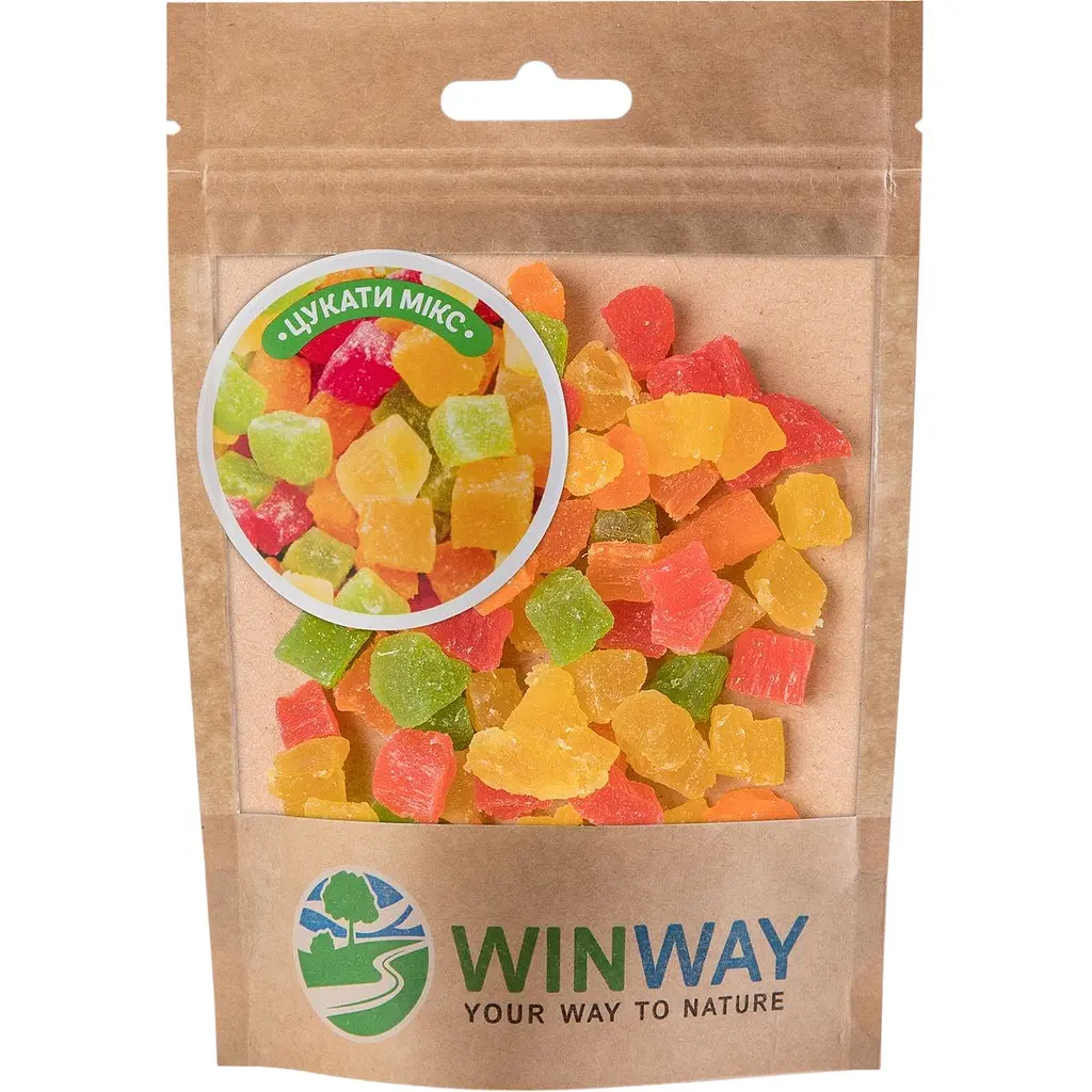 Цукаты микс Winway - это натуральный продукт, полученный путём сушки свежих фруктов, который сохраняет все полезные вещества и неповторимый вкус свежих плодов.