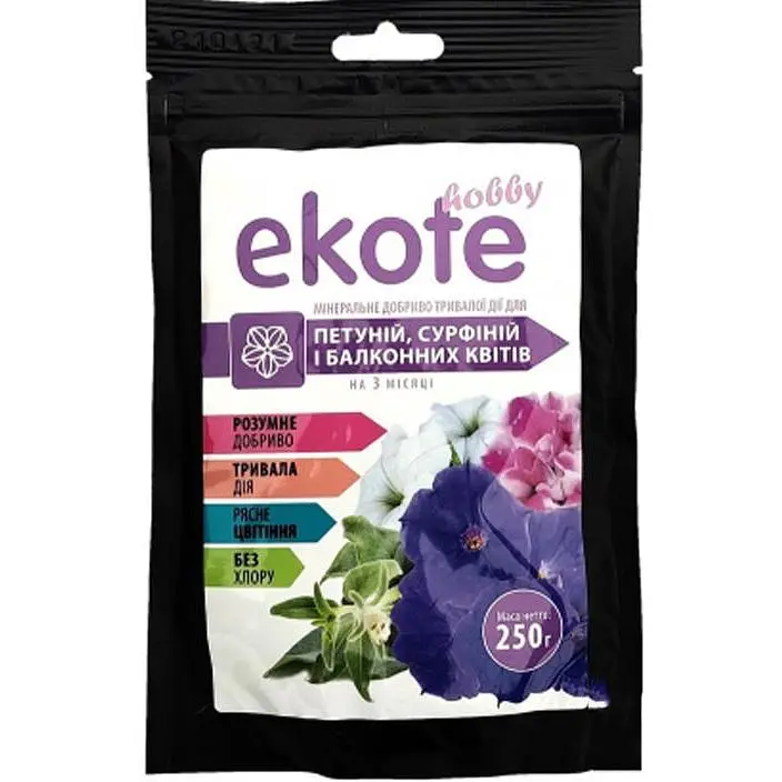 Минеральное удобрение ГТУ Ekote для петуний, сурфиний и балконных цветов - это удобрение длительного действия содержит полный набор элементов, необходимых для полноценной жизнедеятельности цветов в контейнерах. Идеальное соотношение азота, фосфора и калия помогает растению равномерно развивать корни и листья, ускоряет цветение и делает его более продолжительным, что важно при посадке цветов в контейнер. При использовании удобрения бутоны становятся больше и ярче, надолго превращая балкон, подоконник или террасу в собственный райский уголок. Магний положительно влияет на фотосинтез и содержание хлорофилла. Благодаря ему листья цветов приобретают насыщенную зеленую окраску и не выглядят увядшими даже при временном отсутствии полива. Все элементы заключены в крепкую оболочку, которая не позволяет нанести вред корневой системе. Высвобождение питательных веществ происходит постепенно и равномерно в течение всего срока действия в три месяца.