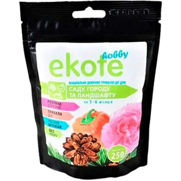 Они идеально сбалансированы по содержанию всех необходимых полезных веществ. Пользование удобрениями Экоте существенно уменьшает время, необходимое для подкормки растений. Удобрение достаточно внести один раз за сезон - его действия хватает на 5-6 месяцев.