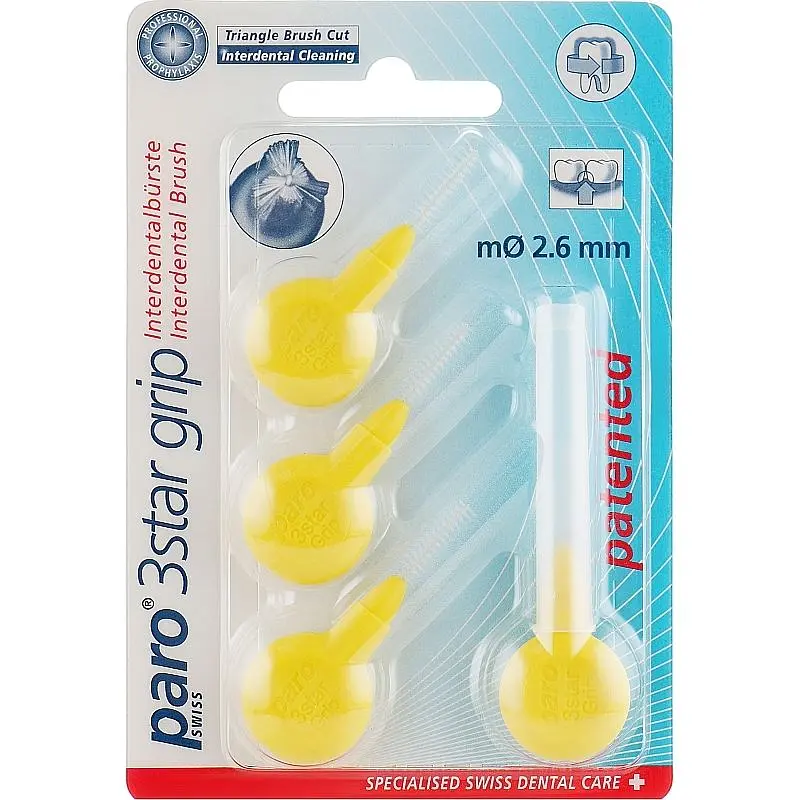 Paro Swiss 3star Grip желтого цвета имеет диаметр щетинок 2.6 мм и отличается треугольной формой, благодаря которой обеспечивает значительное более сильное очищающее действие в отличие от аналогичных приспособлений круглой формы. Благодаря перекрестной форме щетинок она легче проникает в межзубные промежутки. В 3star Grip предусмотрено специальное пластиковое покрытие стержня, которое предотвращает повреждение зубов и десен.