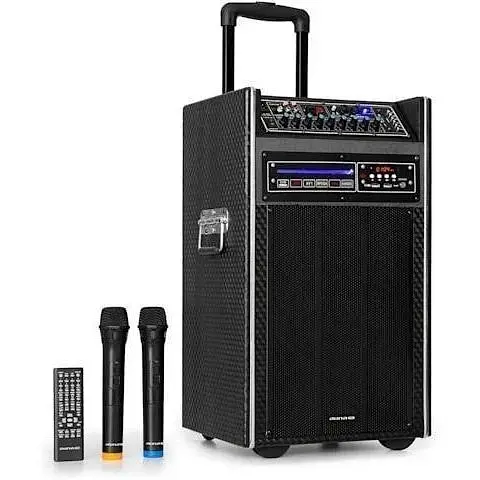 Положите конец хлопотам по подключению отдельных устройств для идеального вокального исполнения! Благодаря встроенному DVD-плееру караоке-видео можно читать в различных форматах и надежно воспроизводить через разъем DVD-Out. Мощный сабвуфер размером 2 x 10 дюймов (25,5 см) с технологией XMR Bass Technology обеспечивает окружение мощными басами, проникающими под кожу, а 3-дюймовый (7,5 см) твитер обеспечивает всестороннее звучание. Широкий спектр вариантов подключения обеспечивает желаемый звук: либо через соединение Bluetooth со смартфона, планшета или MP3-плеера, через порт USB и слот SD, либо через линейное соединение для аудиоустройств Hi-Fi, таких как проигрыватели компакт-дисков и стереосистемы. Микрофон и вход для гитары обогащают мощную звуковую коробку дополнительными возможностями подключения. Беспроводной UHF-радиомикрофон обеспечивает горячие караоке-выступления, зажигательные вокальные выступления и крутые модерации: не связанный кабелями, он сияет бесшумной передачей даже на большие расстояния - идеально подходит для вовлечения любой аудитории. Система auna Pro DisGo Box DVDmobile PA также хорошо оборудована для мобильного использования на мероприятиях: прочный корпус выдерживает большие нагрузки, а удлиненная ручка тележки позволяет даже крупным ди-джеям удобно тянуть систему. Мощная перезаряжаемая батарея 7A 12V обеспечивает от 3 до 5 часов непрерывной работы, а индикатор уровня заряда предотвращает внезапные перерывы в передаче. Конечно, DisGo Box DVD также можно легко подключить к источнику питания. Полноценный пульт дистанционного управления позволяет управлять на некотором расстоянии.