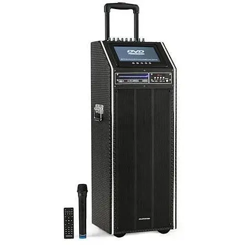 Положите конец забот с подключением отдельных устройств для идеального вокала! С помощью встроенного DVD-проигрывателя видео караоке можно читать в разных форматах и воспроизводить на большом 9" (23 см) TFT дисплее. Два мощных 10" (25,5 см) сабвуфера с технологией XMR тогда как твиттер 3" (7,5 см) ) обеспечивает хорошо округленное звуковое изображение.Различные варианты подключения обеспечивают желаемый звук: через Bluetooth-подключение и слота SD, или через линейный вход от других аудиоустройств Hi-Fi, таких как проигрыватели компакт-дисков и стереосистемы.Не связан кабелями, он сияет без помех даже на большом расстоянии - идеально подходит для привлечения любой аудитории.использование на событиях есть Мобильная акустическая система auna Pro DisGo Box 2100 DVD хорошо оборудована: прочный корпус выдерживает значительную нагрузку, а удлиненная ручка тележки позволяет даже большим ди-джеям удобно Мощный аккумулятор 7A 12V обеспечивает от 3 до 5 часов непрерывной работы.Конечно, DisGo Box 2100 DVD также можно легко подключить к источнику питания. о управление также позволяет управлять на расстоянии.
