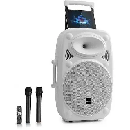 Мобильная система громкой связи Streetstar 15 | Сабвуфер 15 дюймов (38 см) | Макс. мощность 1000 Вт. Светодиодный дисплей | Технология XMR Bass | Функция Bluetooth | Порт USB | Слот для SD | MP3 | Линейный выход | Вход AUX | 2 беспроводных микрофона УВЧ | Функция тележки | Дистанционное управление | Белая