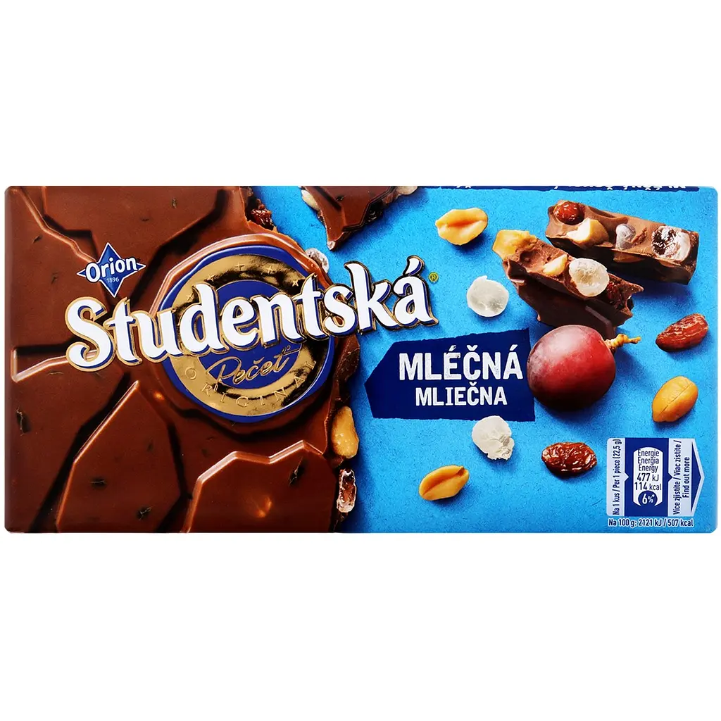 Шоколад Orion Studentska молочный - очень вкусный шоколад из Чехии. Производит шоколад известная кондитерская компания Orion. Шоколад Студенческая печать производится с 1975 со строгим соблюдением оригинального рецепта. Нежный шоколад сочетают с разными начинками, есть много вариантов шоколадок с разными и необычными начинками от чешского производителя. Кондитерский бренд Orion популярен во всей Европе, под ним производят огромное количество разных шоколадок и прочих сладостей. Чешский шоколад настоящий, великолепного европейского качества. Уникальное сочетание молочного шоколада с арахисом, желейными кусочками и изюмом.