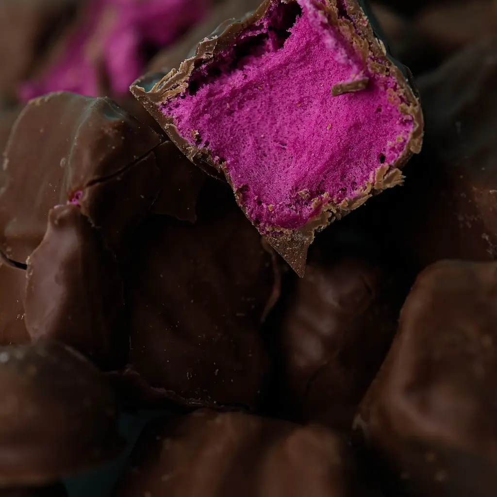 Легендарное сочетание в хрустящем исполнении. Если вы фанат десерта "Пьяная вишня" или просто любите этот дуэт, вам точно понравится. Сладкий молочный шоколад смягчает яркую кислинку вишни, создавая гармоничный вкус. Хрустит, тает, влюбляет.