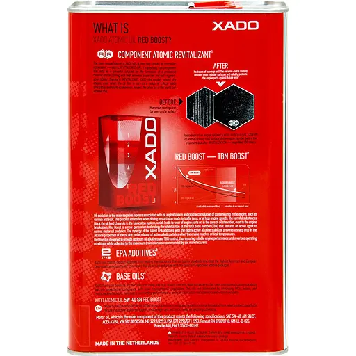 XADO Atomic Oil 5W-40 SN Red Boost - современное универсальное моторное масло для бензиновых и дизельных двигателей легковых и легких коммерческих автомобилей. Может применяться в двигателях, оборудованных каталитическими нейтрализаторами, турбонаддувом и системами прямого впрыска топлива.