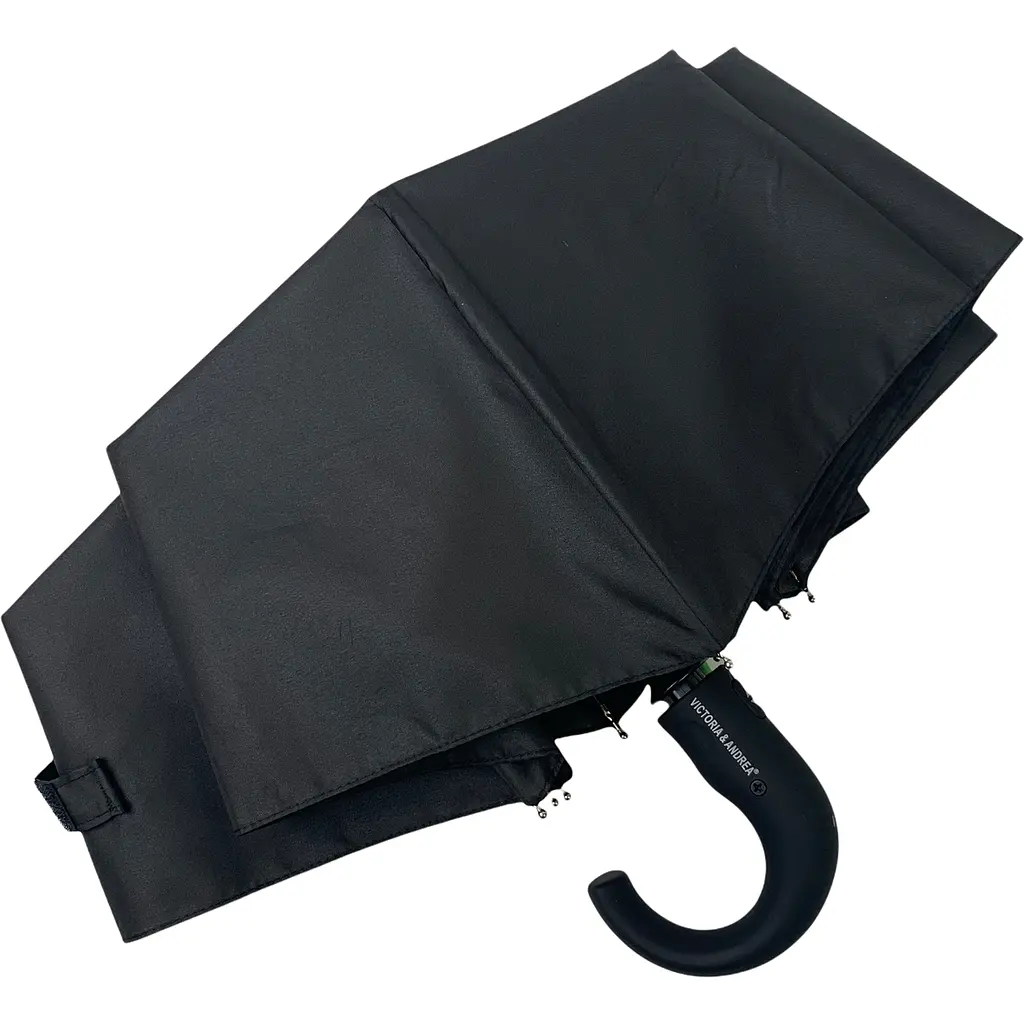 Мужской складной зонт-автомат с ручкой крюк от Victoria-Andrea, незаменимимый аксессуар на непогоду. Как и любой другой классический аксессуар от дождя, он имеет сдержанный дизайн. Никакой клетки, полоски и других елементов декора, только однотонный купол черного цвета. Аксессуар будет отлично сочитаться как с одеждой в деловом стиле, так и с вещами casual или даже спортивками. Данное изделие имеет крепкий каркас и спицы из хромированной стали, прочный полиэстеровый купол, удобную ручку. Открывается и закрывается зонт автоматически, всего лишь с нажатия кнопки.
