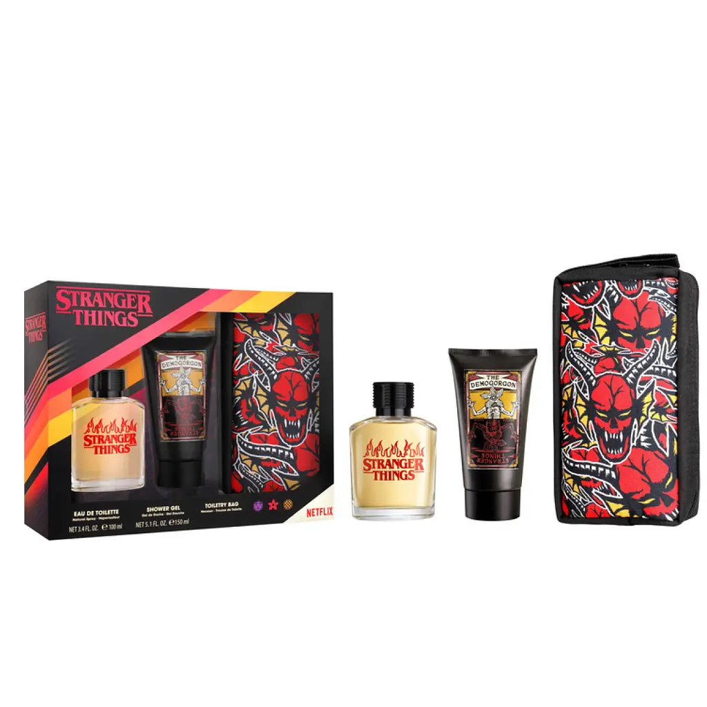 Набор Air-Val International – стильный и атмосферный набор, вдохновленный культовым сериалом Дивные Дива (Stranger Things), который включает туалетную воду 100 мл, гель для душа 150 мл и косметичку в стиле Hellfire Club.
