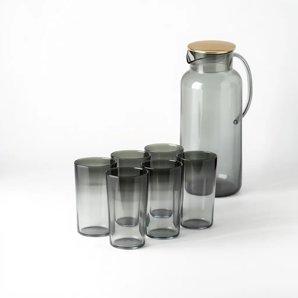 Этот стильный набор посуды "графит" станет элегантной деталью вашего ежедневного или праздничного стола. Лаконичный дизайн, гладкие дымчатые стекла и современные формы идеально подходят для красивой подачи прохладительных напитков: воды со льдом, соков, домашних лимонадов или компотов.