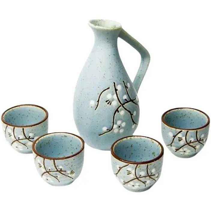 Набор для сакэ NP73SETTEA. Традиционный для Японии рисовый напиток активно завоевывает популярность на наших северных территориях. Здесь уже без набора для сакэ никак не обойтись, ведь львиная доля удовольствия от выпивки - это, собственно, антураж. Набор для сакэ состоит из кувшина токкури и четырех чашек отеко. Кувшин имеет особый носик - катакути и ручку. Традиция требует, чтобы сакэ подавали к столу теплым, поэтому сначала кувшин с напитком нужно поместить в горячую воду. Узкое горлышко не дает сакэ очень быстро остывать. Весь набор прекрасно выдержан в восточном стиле. Мотив цветущей вишни на голубом фоне повторяется в каждом элементе набора.