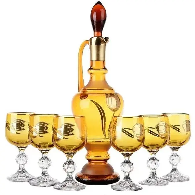 Набор для вина изготовлен из качественного богемского стекла. Материал славится особой чистотой и тонкостью. Такое стекло изготавливают вручную методом выдувания. Изделия из богемского стекла всегда выглядят изысканно. Набор Мортал состоит из графина и шести бокалов светло-коричневого цвета, украшенных золотистым цветком тюльпана. Графин имеет удобную ручку и крышку для сохранения неповторимого аромата вина. Набор украсит любой праздничный стол и станет отличным подарком для настоящих гурманов. Компактный графин с высотой 38 см и диаметром 10 см имеет внушительный объем 980 мл. Объем бокала 150 мл. Набор нужно мыть вручную с моющим средством, подходит любое, кроме абразивных порошков и паст, которые могут оставить на поверхности царапины.