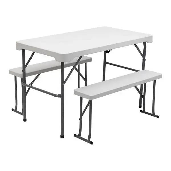 Набор садовой мебели предназначен для комфортного отдыха на открытом воздухе - в саду, на даче или во время выездных мероприятий. Комплект включает стол длиной 112 см и две скамейки по 90 см, рассчитанные на четырех человек. Конструкция изготовлена из металлического каркаса из стальных труб с порошковым покрытием и столешницы из толстого пластика, что обеспечивает устойчивость к внешним воздействиям и длительную эксплуатацию.