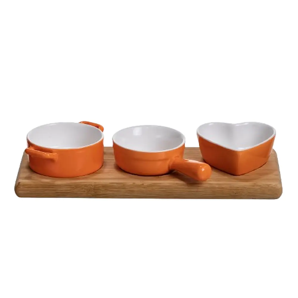 Элегантный набор из трех фарфоровых менажниц на бамбуковой подставке станет практичным и декоративным дополнением к вашей сервации. Менажницы различаются по форме – круглая с двумя ручками, круглая с одной ручкой и сердечная без ручек – что позволяет оригинально подать соусы, специи или небольшие закуски.
