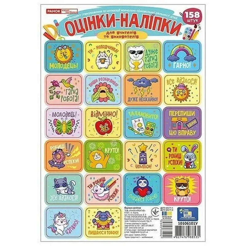 158 яскравих наліпок, які перетворюють навчання на гру та викликають щиру радість у дітей. Кожна наліпка - це похвала, підтримка і стимул до нових досягнень. Створюють позитивну атмосферу в групі чи класі, формують здорову самооцінку та впевненість у собі.