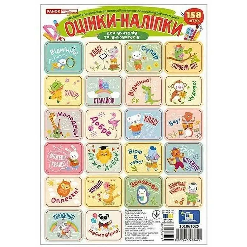 Оцінки-наліпки (зелені) - це не просто наліпки, а чарівні слова підтримки, загорнуті в яскраві барви, милих звіряток і добрі емоції. Вони створені, щоб заохочувати дітей старатись, навчатися з радістю та вірити у власні сили.