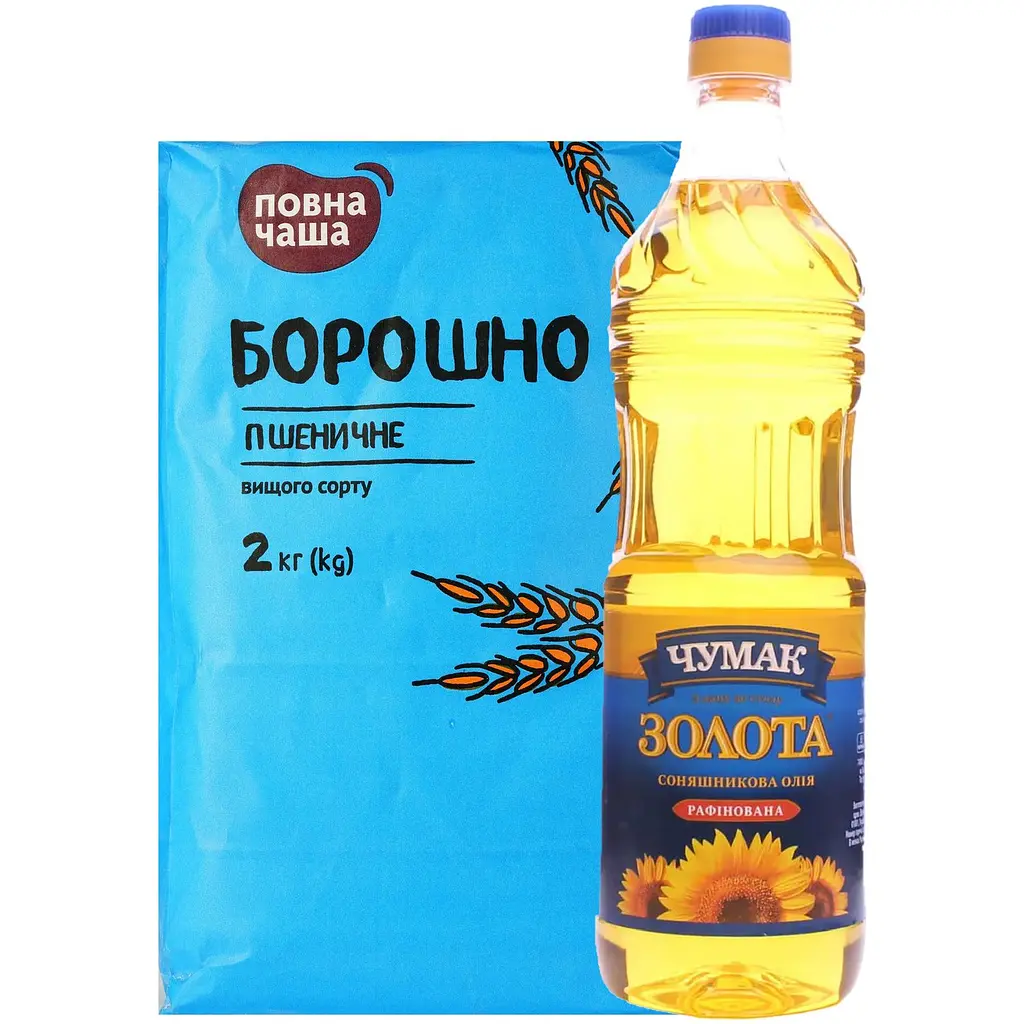 Набор: подсолнечное масло Чумак рафинированное и мука пшеничная Полная Чаша высший сорт - выгодная комбинация для выпечки хлеба, хлебобулочных и кондитерских изделий.