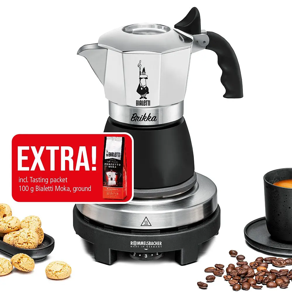 Комплектация: электрическая плита Rommelsbacher RK 501, кофеварка Bialetti Moka Brikka, дегустационный пакет молотого кофе Bialetti Moka, 100 г.