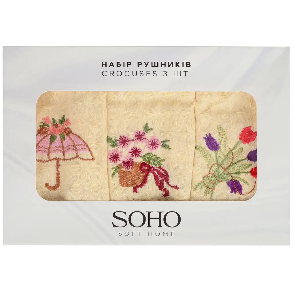 Набор полотенец Soho Crocuses изготовлен из 100% хлопка. Они долго сохраняют привлекательный внешний вид, станут стильным атрибутом и незаменимыми помощниками на вашей кухне.