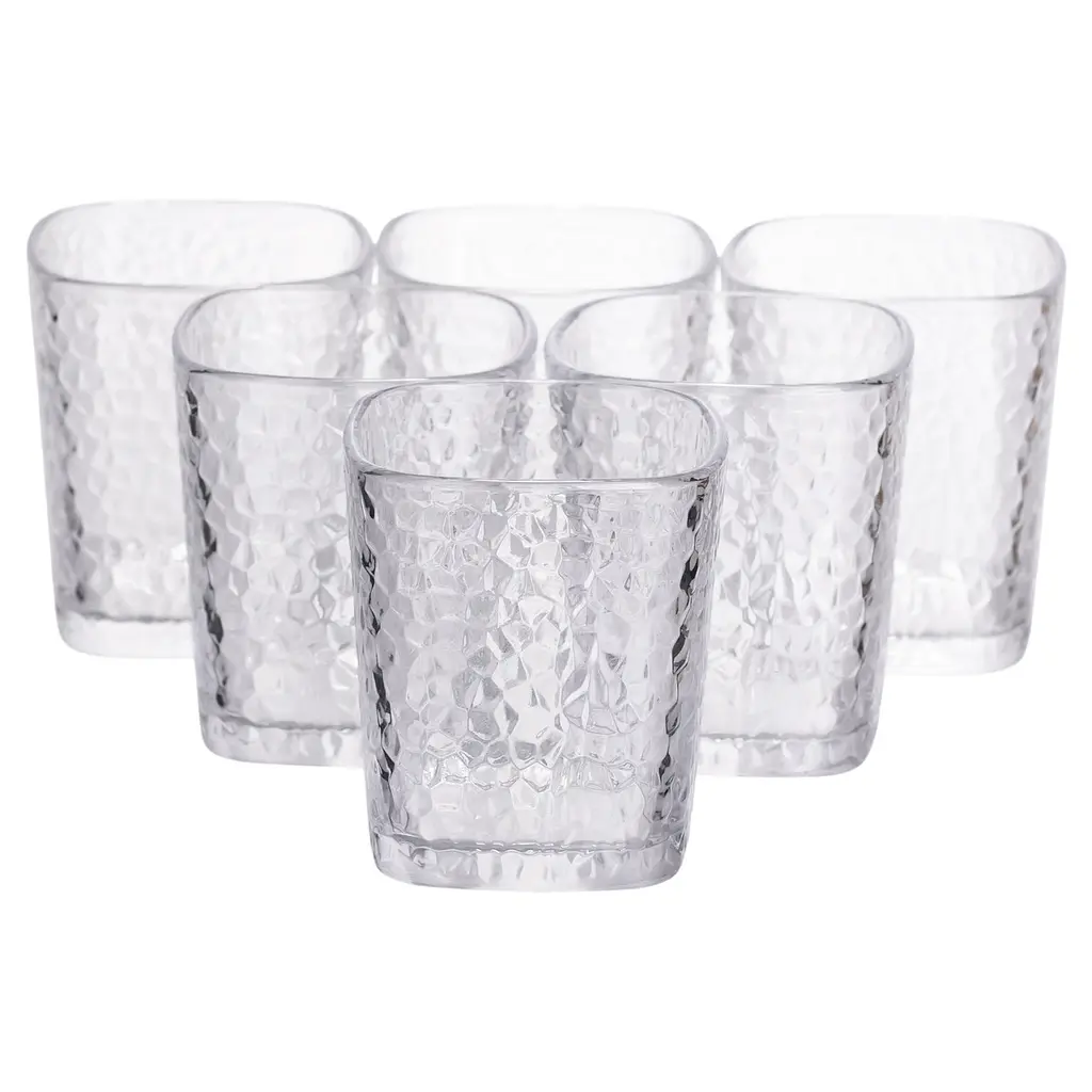 Набор квадратных стаканов из толстого стекла сочетает в себе современный дизайн, практичность и долговечность. Их рельефная поверхность придает оригинальный внешний вид и предотвращает скольжение, обеспечивая удобное удержание в руке. Прозрачное стекло подчеркивает цвет напитков, делая подачу воды, сока или коктейлей особенно привлекательным.