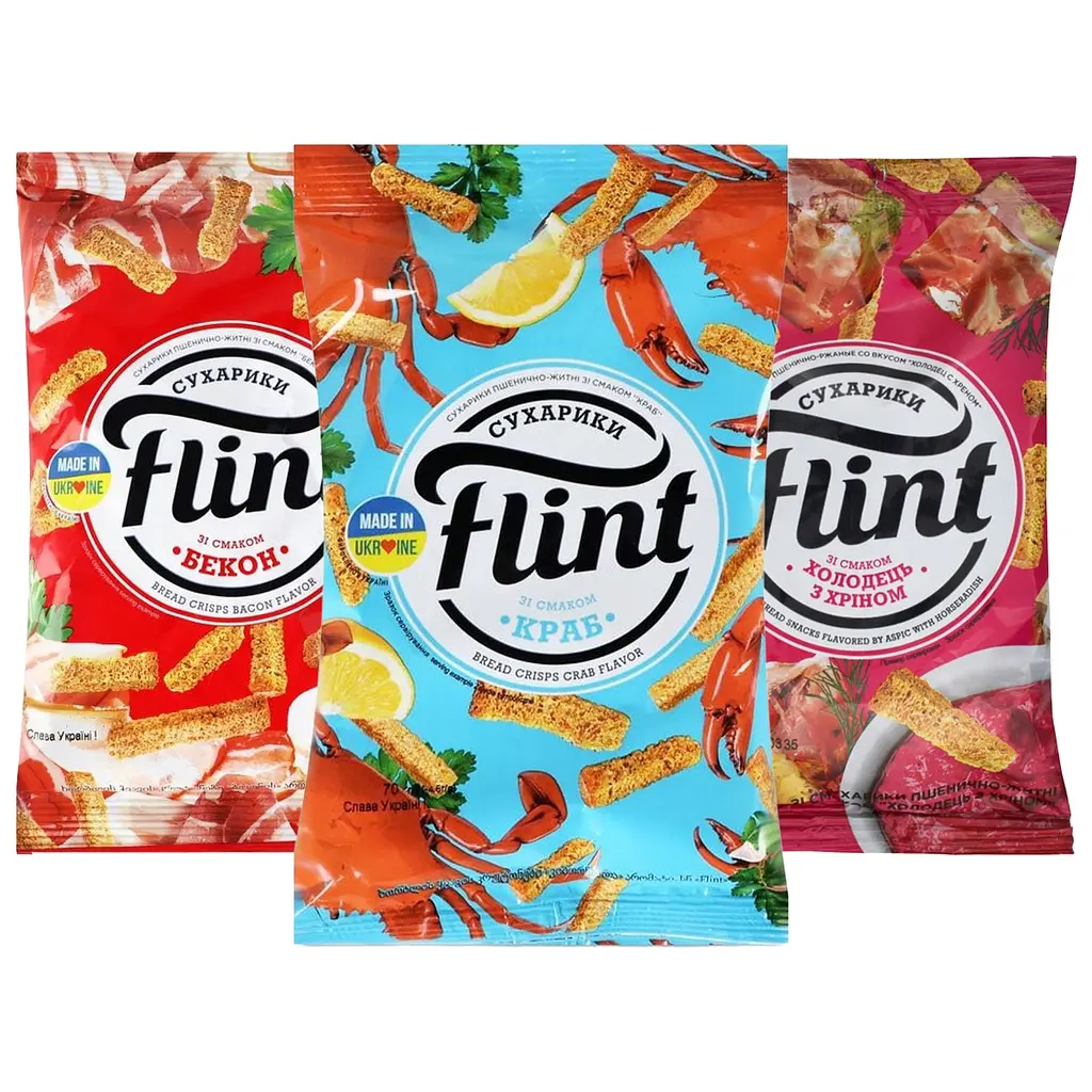 Сухарики Flint пшенично-ржаные со вкусом холодца и хрена – пикантные и хрустящие сухарики с ярко выраженным традиционным вкусом. Острота хрена отлично оттеняет насыщенный мясной аромат, создавая неповторимое сочетание для настоящих ценителей выразительных перекусов.